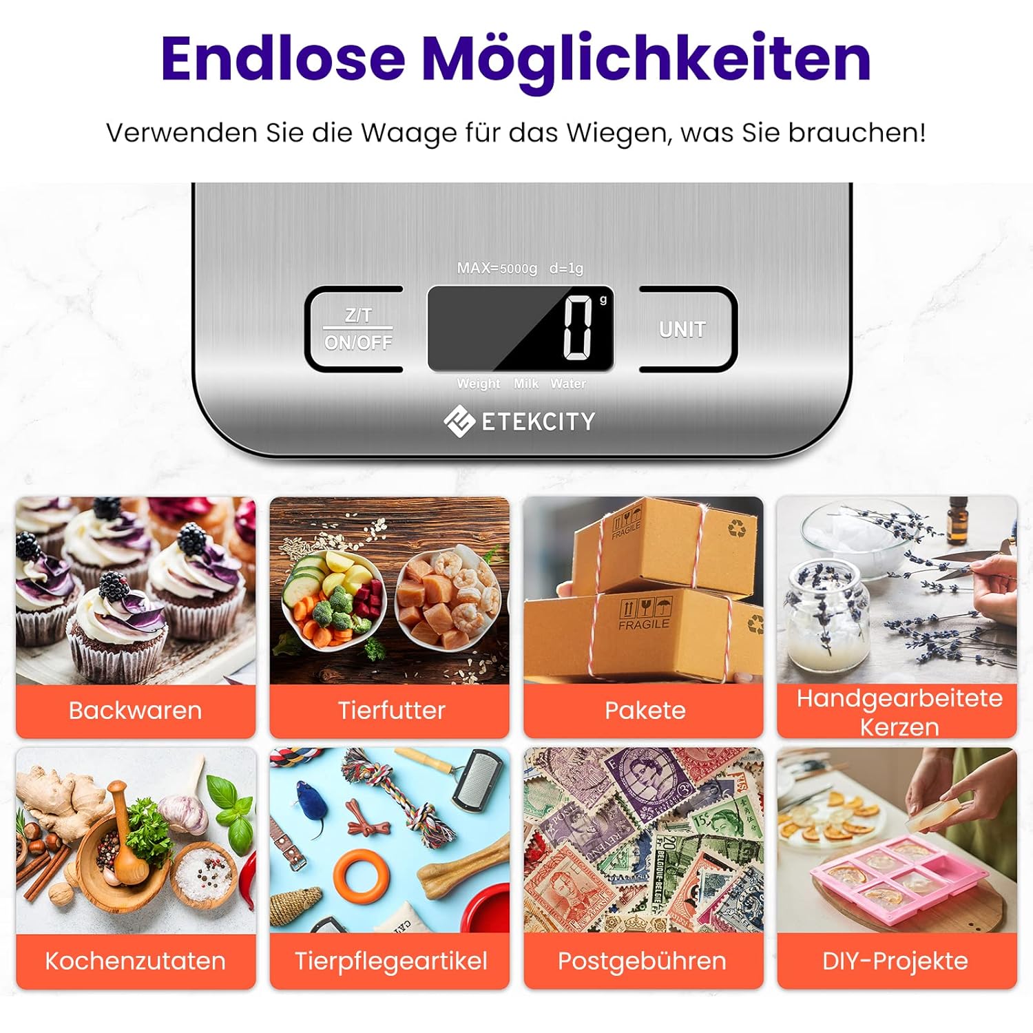 ETEKCITY Küchenwaage, digital 5KG mit großem LCD-Display,Digitalwaage, Briefwaage mit Großer Edelstahl Wiegefläche, Flüssigkeitsmessung, hohe Präzision auf bis zu 1g, Tara-Funktion, Silber